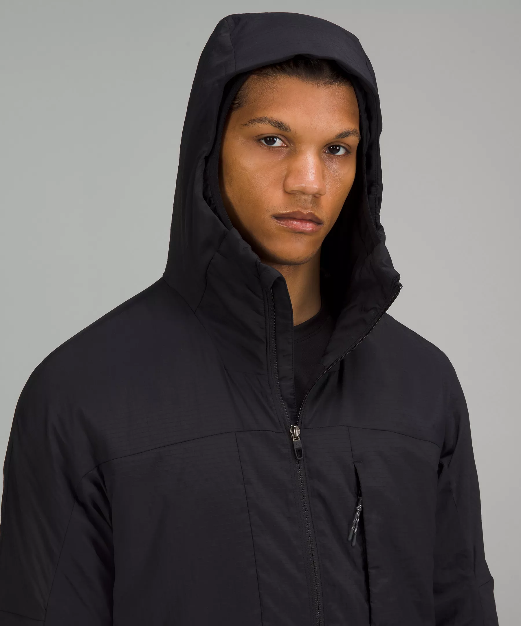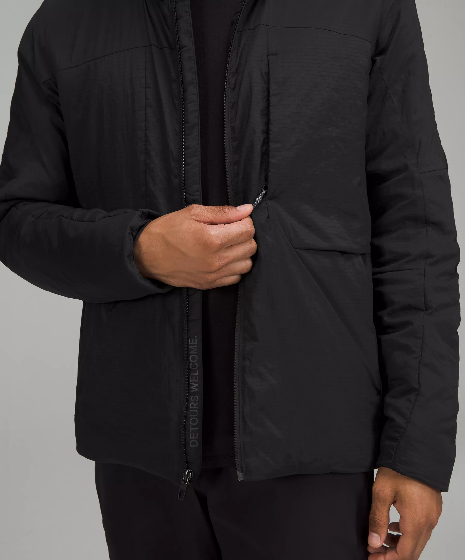 - Zippered chest pocket with a hidden phone sleeve