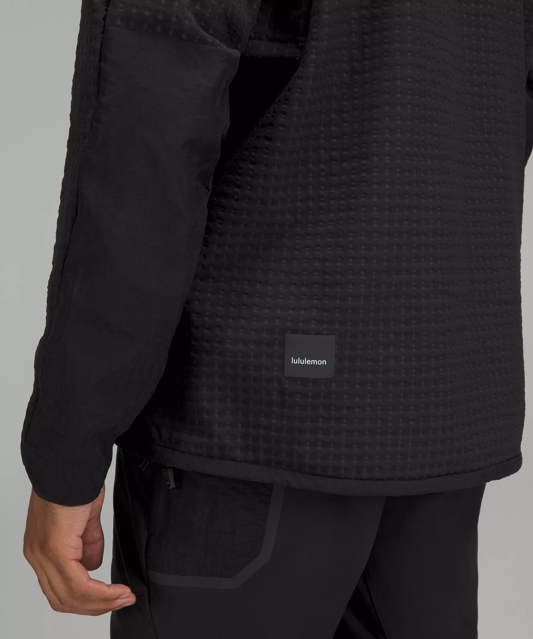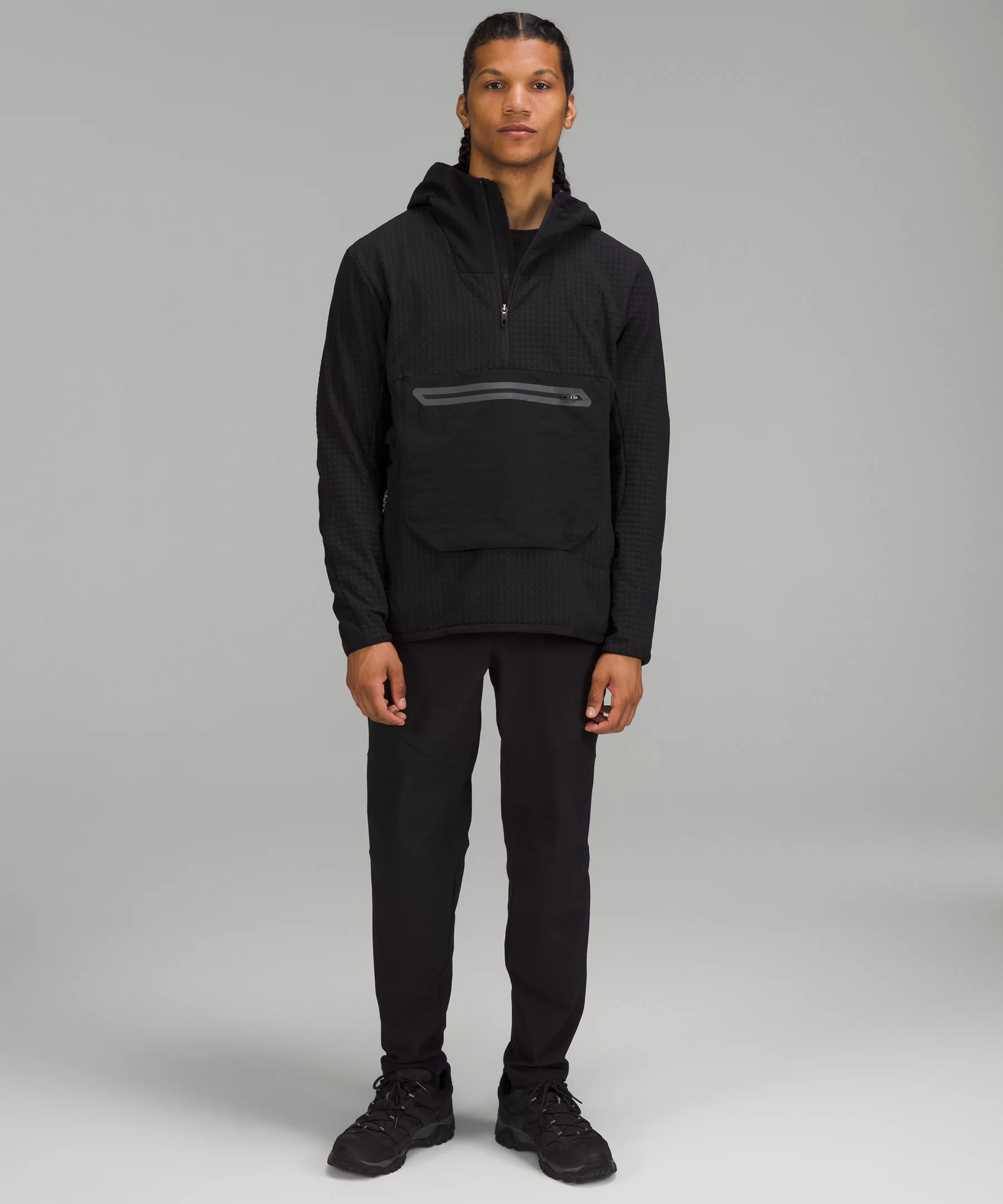 - Hand pockets with a hidden phone sleeve and a top-entry pouch pocket