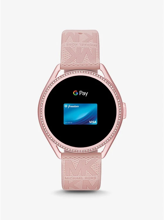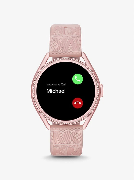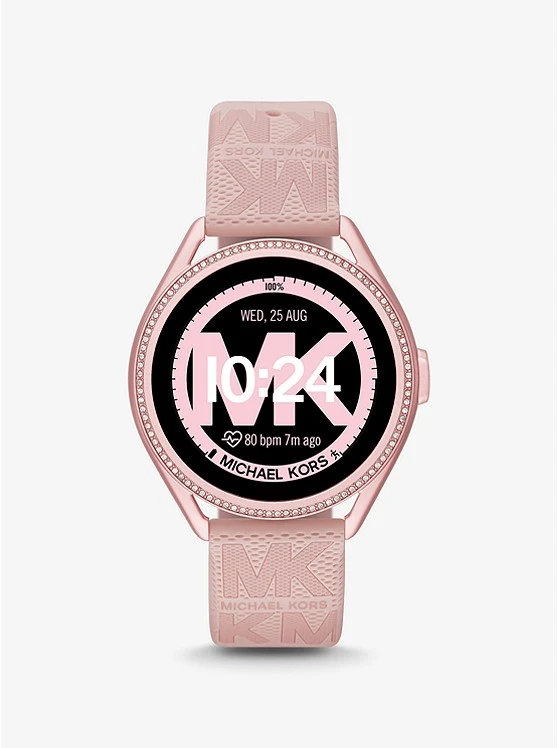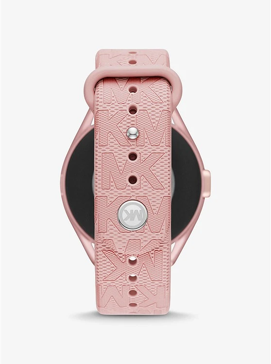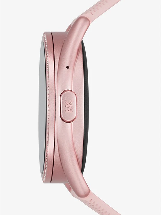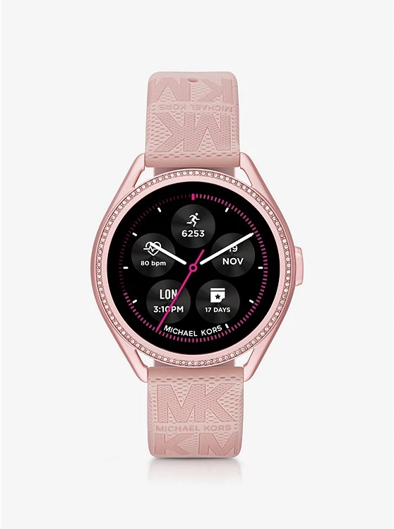 Sport-luxe style: featuring a logo-embossed strap, our Michael Kors Access Gen 5E MKGO 2 smartwatch will effortlessly complement your on-the-go, active lifestyle. Designed from lightweight pink-tone aluminum and powered by Wear OS by GoogleTM, this pave-accented timepiece is equipped with estimated heart-rate tracking, payment methods, a built-in speaker for Bluetooth-enabled calling and more to keep you connected to your daily goals. The multiple display faces can be changed for the ultimate in customization.