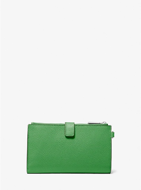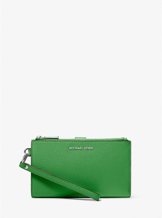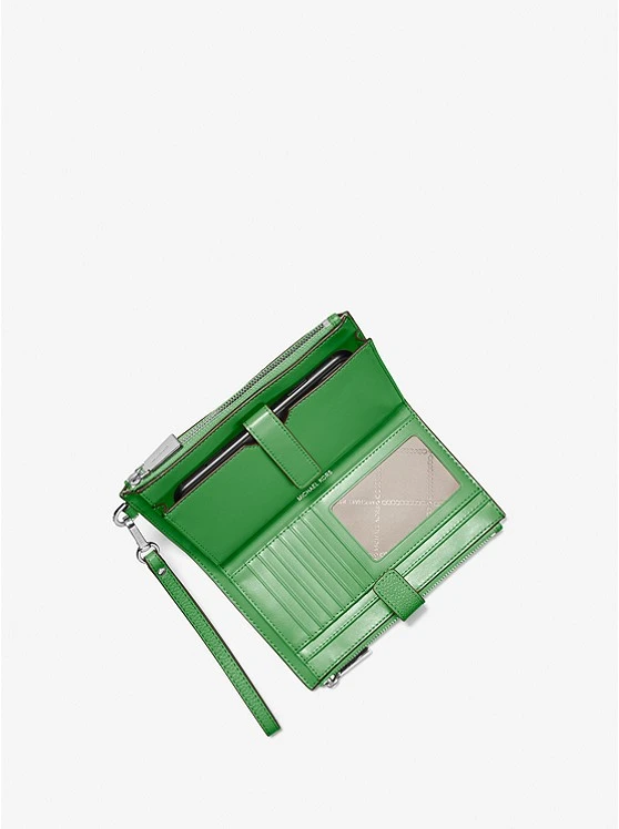 Done in a rich pebbled leather for timeless status, this sleek wallet has two zip sides that unfold to reveal a center with pockets for all the essentials, from credit cards to your smartphone. A wristlet strap perfects its versatility factor, so it can be carried alone or in a tote.