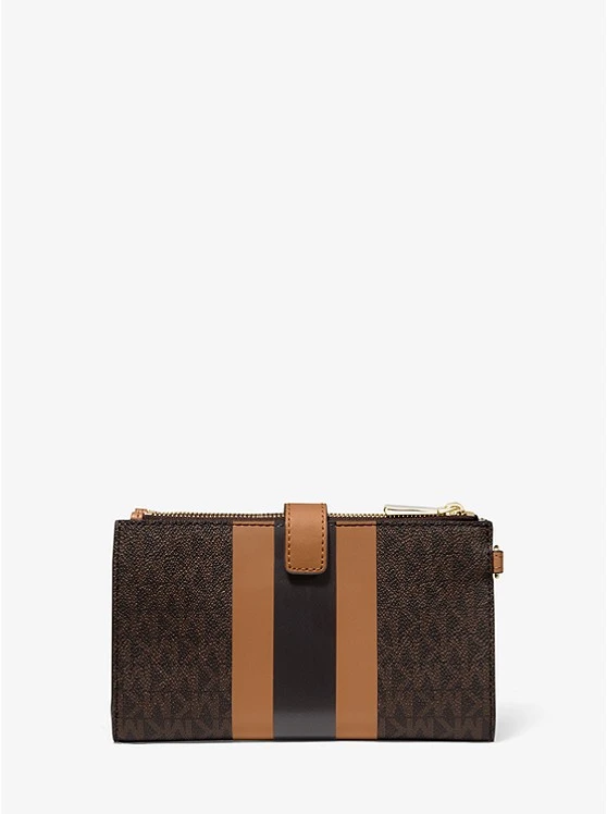 Crafted from Signature-print canvas accented with a sporty center stripe, this wallet has two zip sides that unfold to reveal a center with pockets for all the essentials—from credit cards to your smartphone. A detachable wristlet strap makes it versatile enough to carry alone or in a tote.