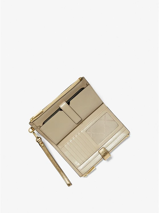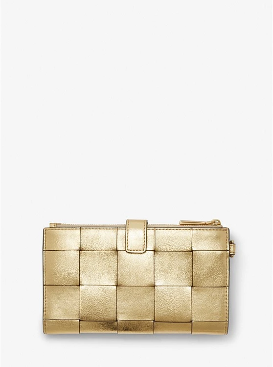 Crafted from woven strips of eye-catching metallic leather, this wallet has two zip sides that unfold to reveal a center with pockets for all the essentials—from credit cards to your smartphone. A detachable wristlet strap makes it versatile enough to carry alone or in a tote.