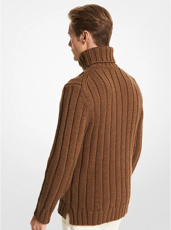 This turtleneck sweater is knitted from extra-fine merino wool for a notably soft handle. A thick cable pattern with ribbing at the edges helps to retain its shape. Wear it with dark trousers.