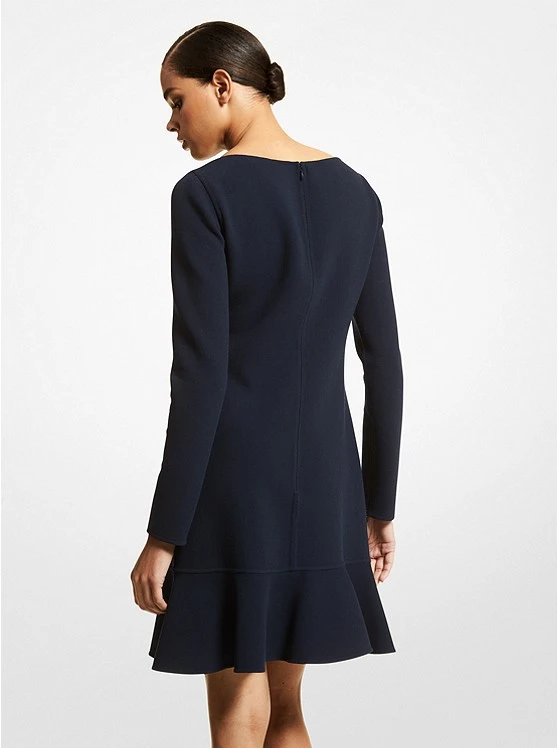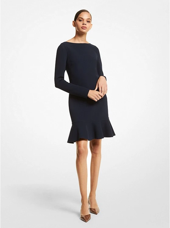 This ruffle-trimmed mini dress redefines elegance. Tailored in Italy from virgin wool with hints of stretch, it features a classic boat neckline that grazes the collar bone and descends to a drop waist silhouette. The midnight-blue hue will look best styled with the season’s chestnut pumps and handbag.
