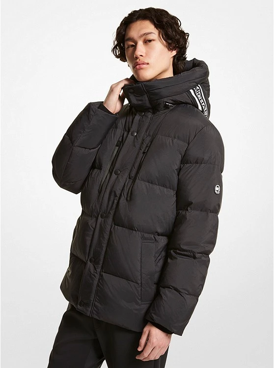 Sport-luxe style and functionality combine in this superbly warm nylon puffer jacket. Featuring a cozy funnel neck and insulated with fill made from 100% recycled polyester, it keeps chilly weather at bay. Four pockets at the front let you stow belongings within reach, while our logo tape at the hood finishes it with signature appeal.