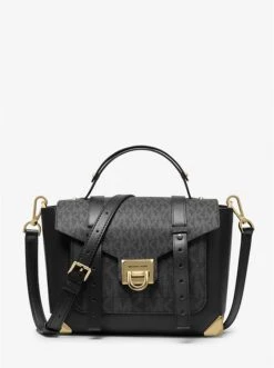 The Manhattan satchel lends modern appeal to the classic trunk bag style. Skillfully crafted from smooth leather with a scaled-up take on our signature print, it’s defined by metal corners and distinctive stud hardware. A flip-lock closure opens to reveal an exterior front slip pocket that provides easy access to your phone.