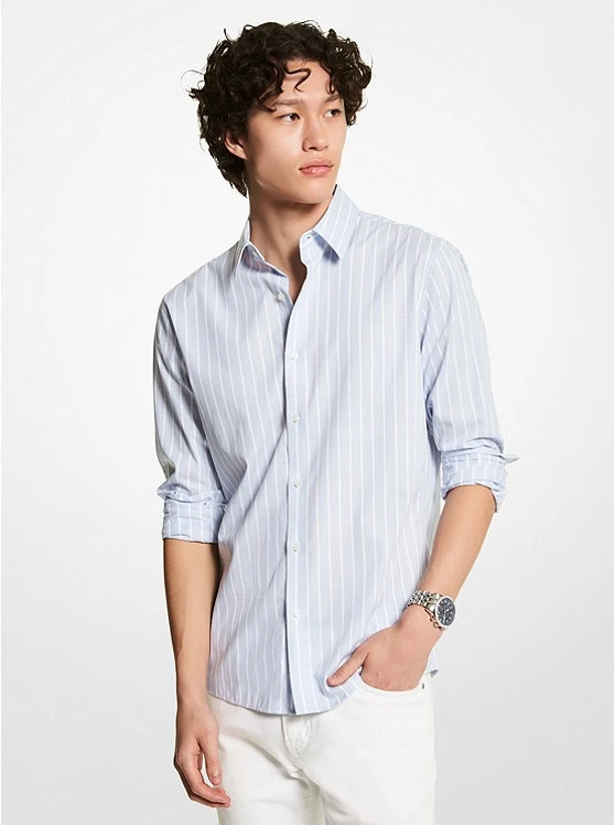 A subtle way to introduce pattern to your shirting, this striped button-down is made from stretch-cotton and cut for a slim fit. Dress it up with tailored separates, or wear it untucked with denim for a more casual look.