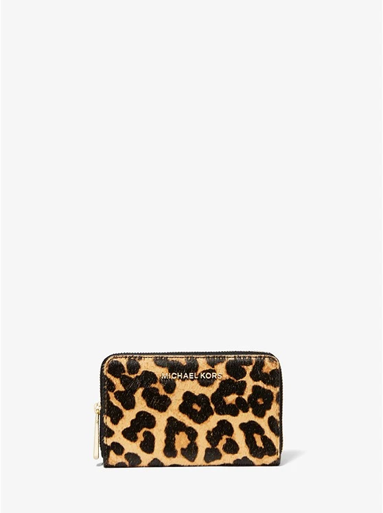 Designed in a compact zip-around silhouette, this leopard-print calf hair leather wallet opens to reveal multiple card slots and space for your cash. We love how an exterior slip pocket offers quick access to your ID. Slip it into an equally bold tote bag, or a clutch come evening.
