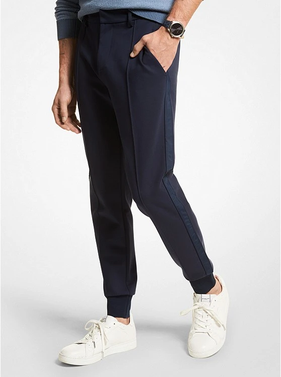 Cut in a versatile, straight-leg silhouette with classic tapered cuffs, these stretch knit joggers offer elevated style and maximum comfort. Pleated seams, belt loops and a front button closure create a trouser-like effect, while textured racing stripes down the side give the style an athletic sensibility. Wear yours with a complementing sweater and sneakers on weekends.