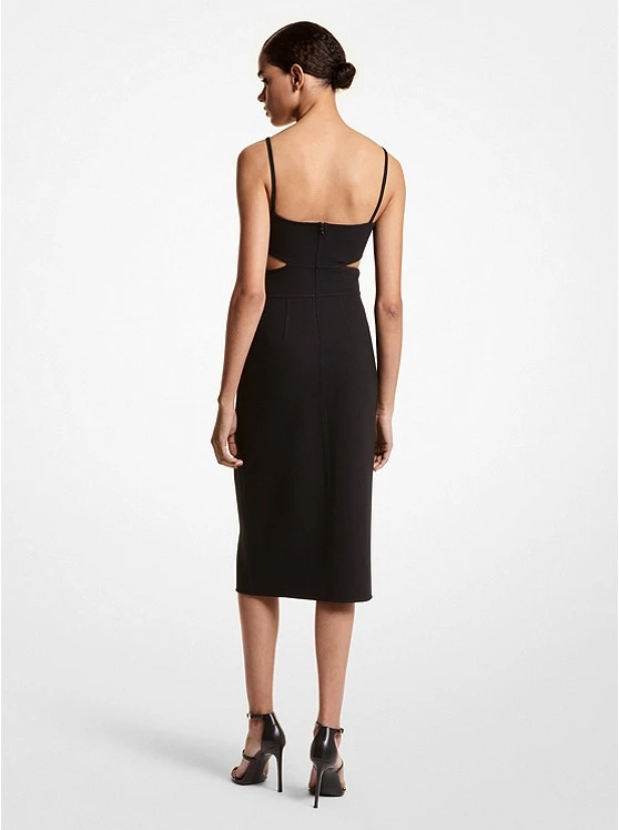 Alluring cutouts and a rounded neckline take this otherwise timeless sheath dress into modern territory. Wool crepe with hints of stretch and contoured seam detailing showcase fine Italian tailoring, while a concealed zip fastening along the back adds a functional finish. Keep focus on the slender shoulder straps with slicked-back hair.