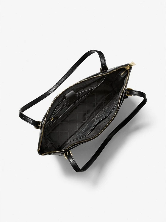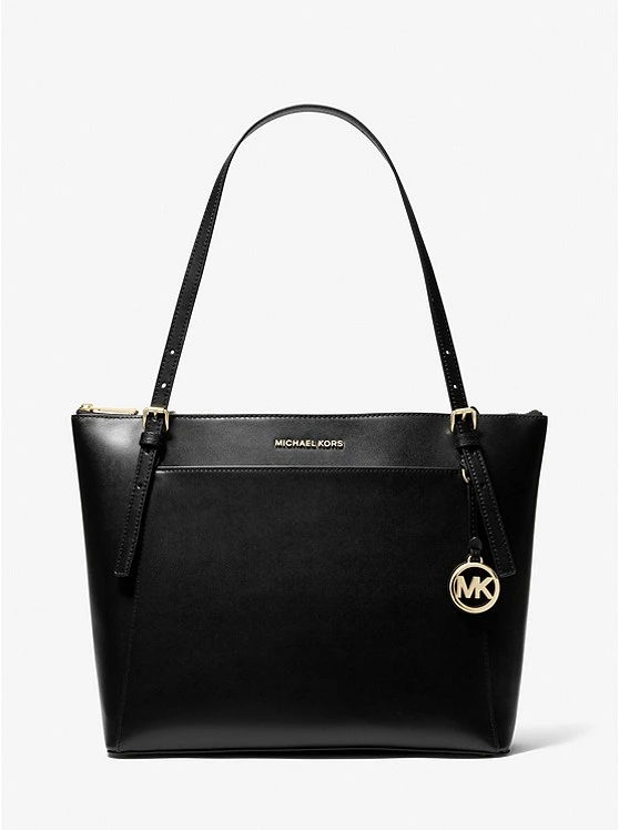 Our beloved Voyager tote bag receives a chic update. Crafted from smooth leather in a clean silhouette, this style features slim shoulder straps and top-stitch detailing for a refined finish. We love how the MK charm hardware lends luxe appeal.