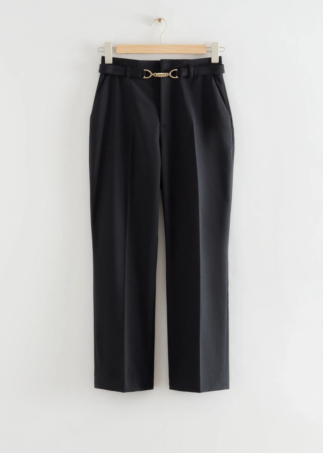 Cropped high waist trousers featuring a golden-coloured buckle belt and press creases in a slim fit silhouette.
