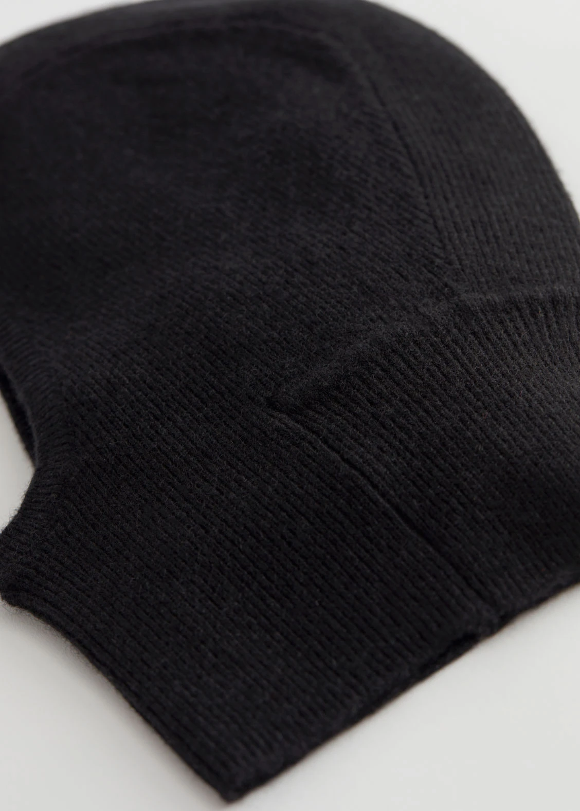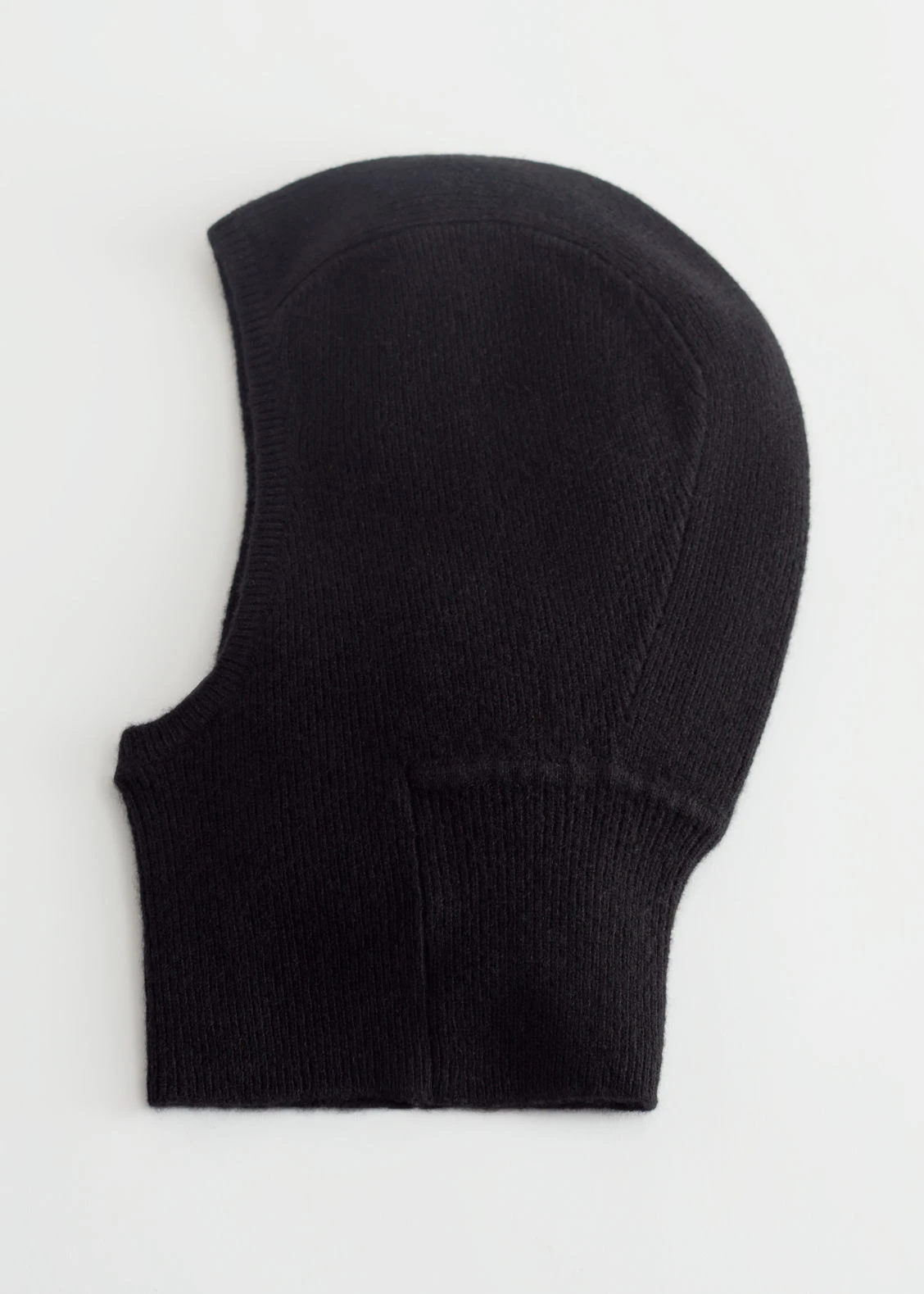 Cashmere knitted hood featuring a ribbed face opening.