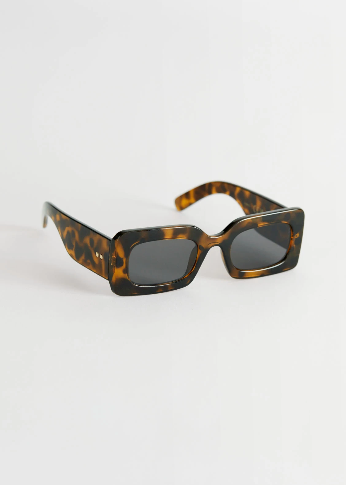 Chunky sunglasses with rectangular frames and wide temples.100% UV protection