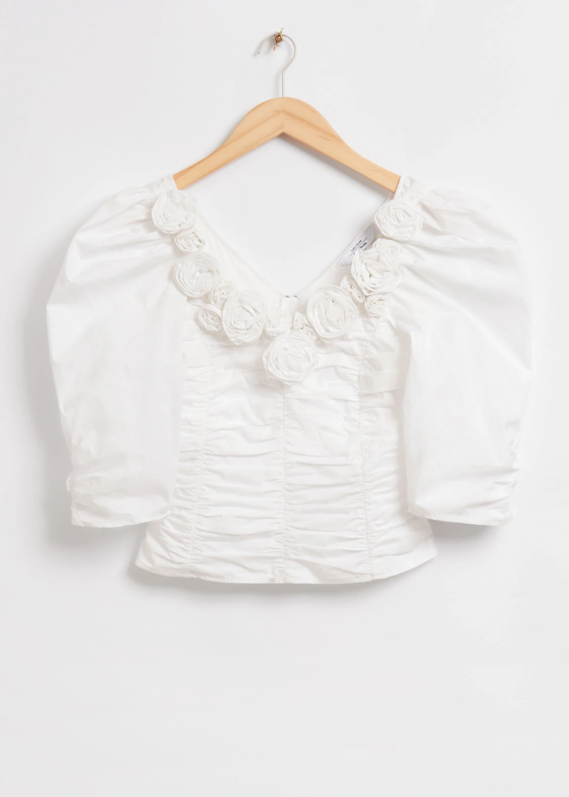 Rose adorned balloon sleeve blouse made from cotton featuring 3D rose lined v-cut front, and back neckline, a ruched fitted body, and large gathered short balloon sleeves finished with a lapped back zip closure.