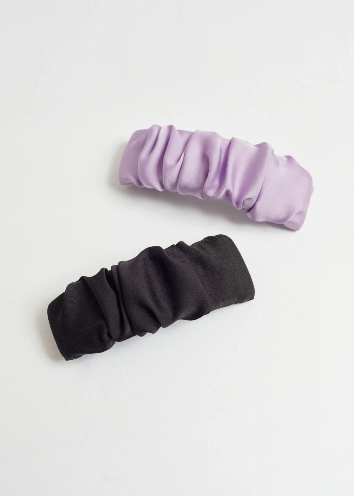 Two hair clips in a glossy, ruched satin finish.