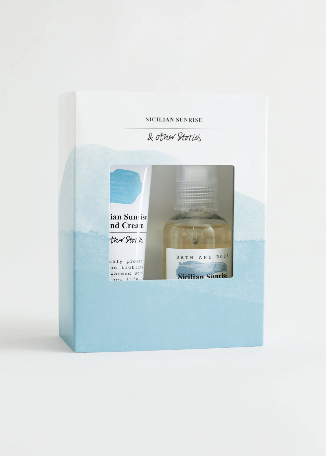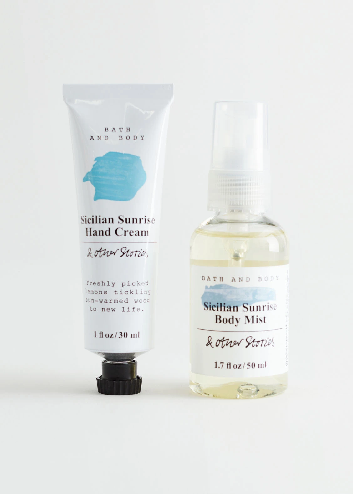 A compact bag-friendly kit consisting of mini-versions of our luxurious hand-cream (30 ml / 1.0 fl oz.) and refreshing body mist (50ml/1.7 fl oz), delicately scented with our fragrance Sicilian Sunrise in fruity notes of lemon, pineapple and pear against a musky cedarwood and amber base. Ideal for taking on-the-go for spontaneous application throughout the day.