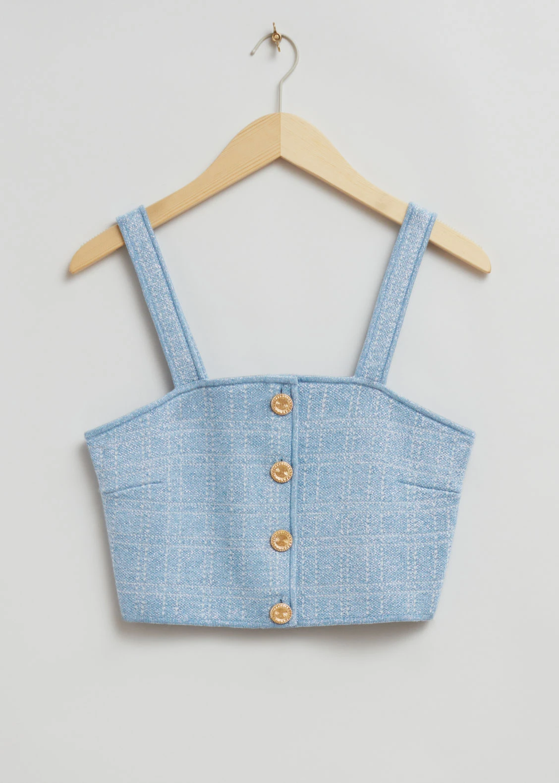Tweed knit buttoned bustier top crafted from a blend of materials. Traced with four faux gold buttons this top is edged with a tubular trim and two front darts that gently hug the body, cut in a cropped silhouette. For a complete set, pair with the matching trousers.